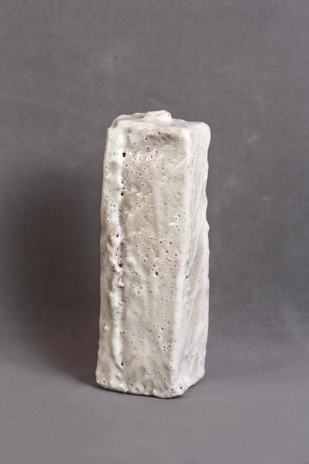 Vasija/ florero de cerámica maciza, vidriado shino gris claro y vetas rosadas
