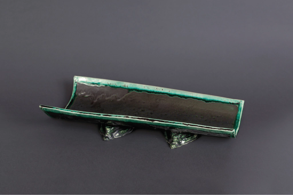 Pieza de creámica esmaltada en gris plata con bordes verde difuminados